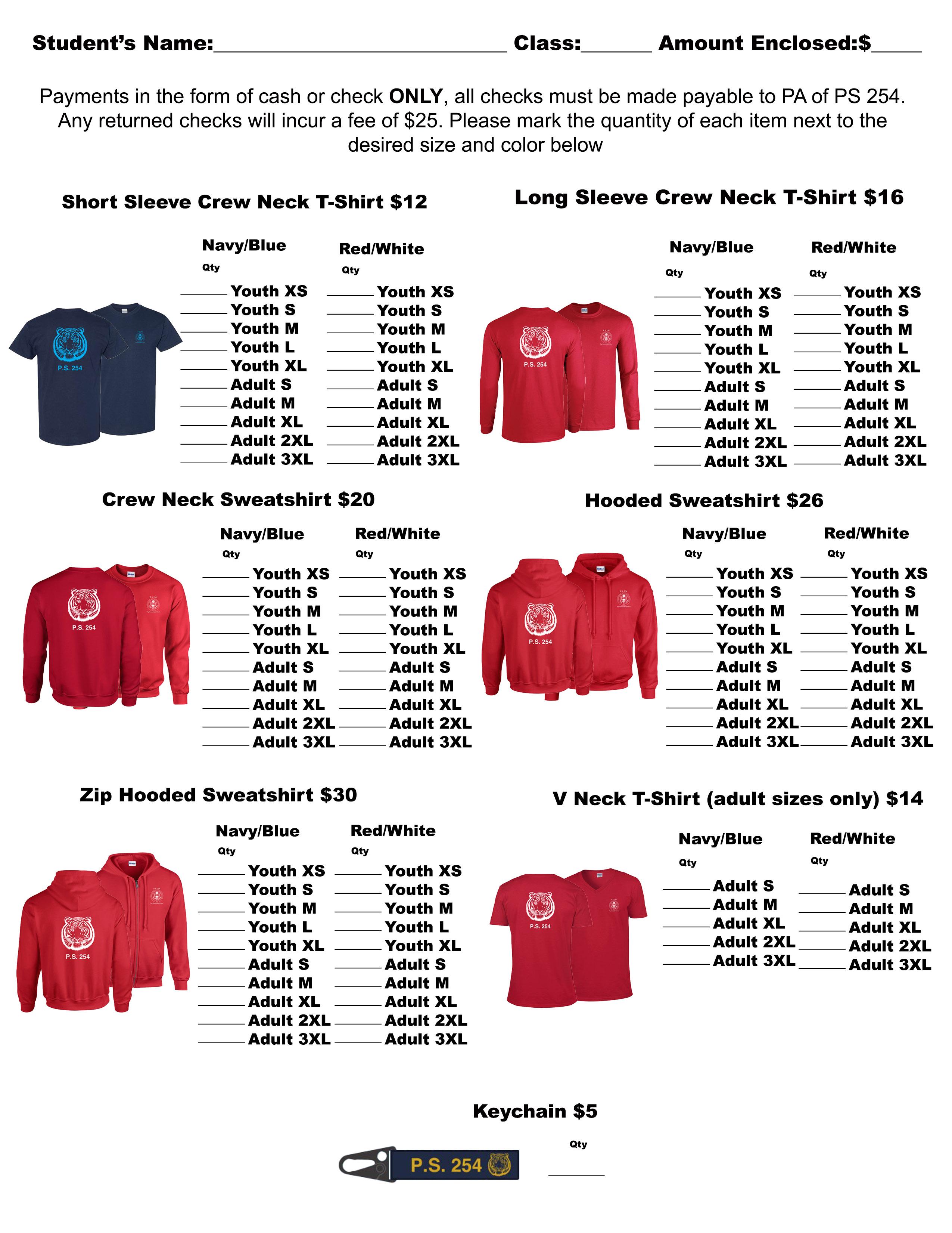 P.S. 254 Spirit Day The PS 254 Spirit Wear order forms were sent home! (And is also attached for your convenience.) Please place your orders by Friday, October 17th